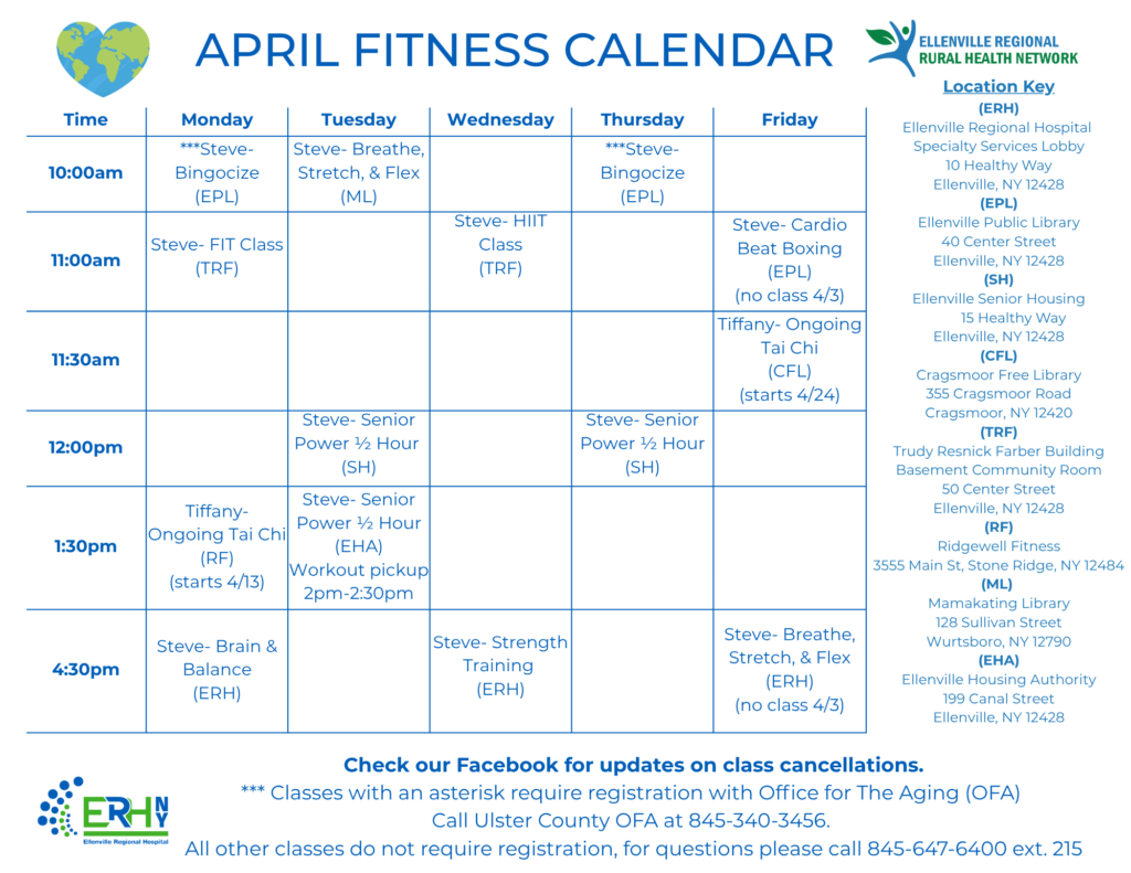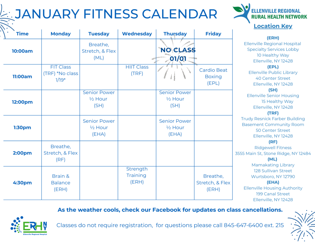 The Ellenville Regional Rural Health Network (ERRHN) is committed to improving community well-being by making physical fitness opportunities accessible to everyone. Our initiatives include organizing fitness classes, promoting local walking programs, and partnering with community centers to provide a range of activities suited to all ages and abilities.